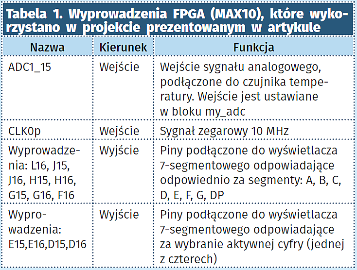 - my_adc. Moduł przetwarza wartość analogową z czujnika temperatury na wartość cyfrową. Wykorzystano w nim komponent ADC wygenerowany przy pomocy narzędzia Qsys programu Quartus Prime Lite. W module można ustawić, który kanał ma być wejściem analogowym przetwornika. W projekcie jest to kanał nr 15 – ADC1_15, co wynika ze sposobu podłączenia sensora STLM20 do wyprowadzeń FPGA. Wejścia i wyjścia tego modułu opisano w tabeli 2.