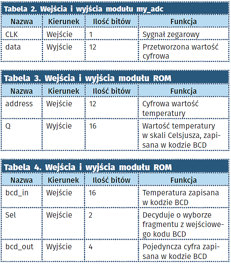 - ROM. Jest to moduł pamięci ROM, zainicjalizowanej ręcznie utworzonym plikiem LUT.mif. Moduł odpowiada za przetworzenie wartości otrzymanej z czujnika temperatury na wartość w skali Celsjusza w kodzie BCD. Przeliczenie jest zrealizowane za pomocą techniki tablicowania (Lookup Table). Moduł został wygenerowany przy pomocy IP Core’a ROM: 1-PORT dostępnego w programie Quartus Prime Lite. Ze względu na znaczne wahania wartości odczytanej z czujnika temperatury w pliku LUT.mif nie została zamieszczona część dziesiętna wartości przedstawiającej temperaturę (dla każdej wartości część dziesiętna jest równa zero). Wejścia i wyjścia modułu ROM opisano w tabeli 3.