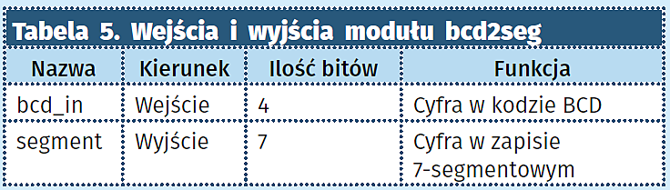 - bcd2seg. Moduł otrzymaną cyfrę w kodzie BCD zapisuje w notacji 7-segmentowej. Wejścia i wyjścia tego modułu opisano w tabeli 5.