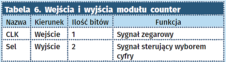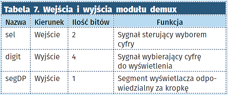 - demux. Demultiplekser wybiera cyfrę do wyświetlenia, dodatkowo włącza kropkę oddzielającą część dziesiętną wartość temperatury. Wejścia i wyjścia tego modułu opisano w tabeli 7.