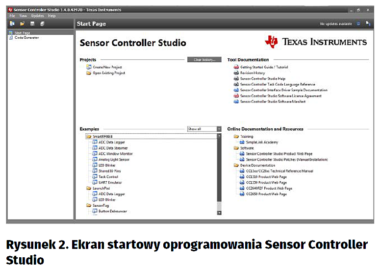 Po zakończonej aktualizacji uruchamiamy oprogramowanie Sensor Controller Studio. Prezentowany jest ekran startowy aplikacji, którego wygląd pokazano na rysunku 2. Dostępne są okna z historią projektów z przykładami oraz z dokumentacją. Na szczególna uwagę zasługują przygotowane przez Texas Instruments przykłady oraz dokumentacja obsługi oprogramowania. Dokumentację Sensor Controller Studio Help możemy uruchomić z okna startowego aplikacji, z menu Help albo korzystając ze skrótu klawiaturowego (klawisz F1). Pozostałe funkcje oprogramowania Sensor Controller Studio są aktywowane w momencie utworzenia projektu. Zostaną omówione w dalszej części artykułu przy okazji tworzenia projektu urządzenia do bezdotykowego pomiaru temperatury obiektu.