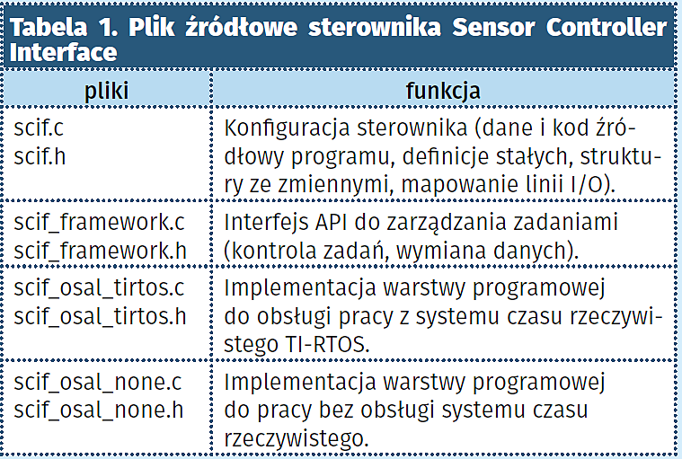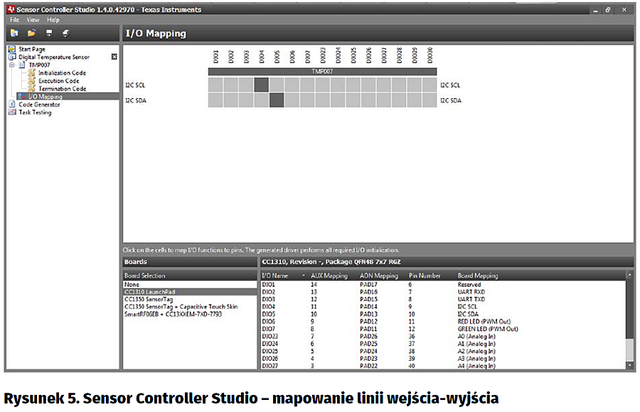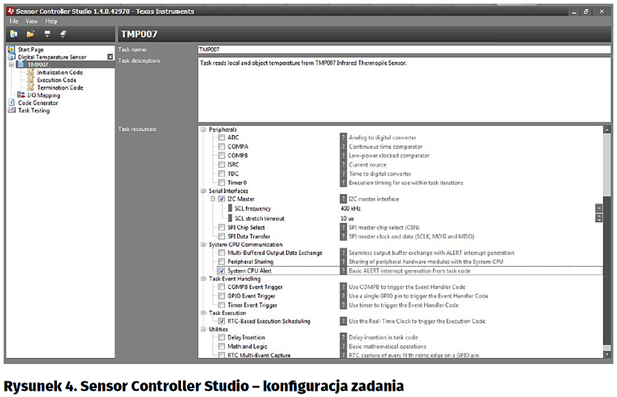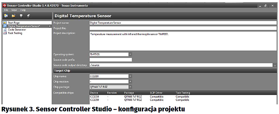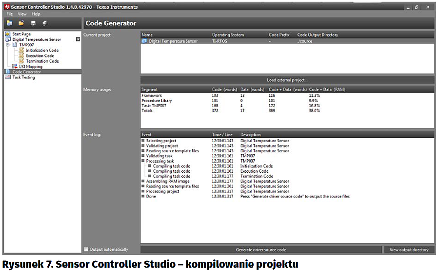 Na zakończenie pracy z oprogramowaniem Sensor Controller Studio generujemy pliki sterownika SCIF. W tym celu, aby otworzyć okno kompilatora, z panelu projektu wybieramy opcję Code Generator. Jeśli projekt nie zawiera błędów, wybieramy opcję Generate driver source code. Oprogramowanie tworzy pliki wynikowe sterownika SCIF, które należy dołączyć do projektu w Code Composer Studio. Dodatkową funkcją oprogramowania Sensor Controller Studio jest możliwość emulowania pracy zdefiniowanych zadań. Opcje emulatora dostępne są w menu programu w zakładce Task Testing.