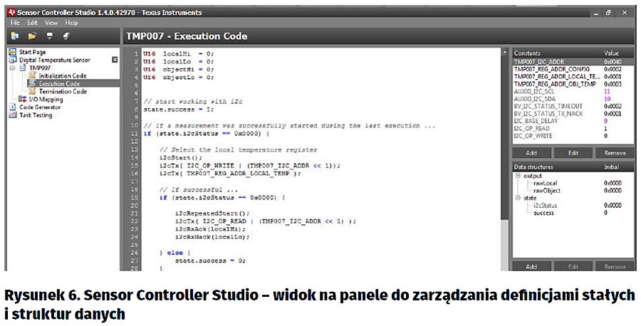 W sekcjach z definicją kodu programu: inicjalizacja, wykonanie, zakończenie wprowadzamy kod źródłowy zadania do obsługi czujnika TMP007. Korzystając z protokołu I2C ustawiamy parametry pomiaru a następnie odczytujemy zmierzoną temperaturę otoczenia oraz temperaturę obiektu. Kod źródłowy sekcji wykonania Execution pokazano na listingu 1. W kodzie źródłowym zadania tworzymy definicje stałych (adres I2C czujnika TMP007, adresy rejestrów czujnika) oraz definiujemy zmienne globalne umieszczone w strukturach danych (status pomiaru, wynik pomiaru temperatury otoczenia, wynik pomiaru temperatury obiektu). Panele do zarządzania definicjami stałych oraz strukturami danych ze zmiennymi globalnymi (dodawanie, usuwanie, edycja) są dostępne w każdym z bloków kodu programu po prawej stronie okna aplikacji. Wygląd panelu pokazano na rysunku 6. Wprowadzając definicje stałych podajemy nazwę, typ oraz wartość definiowanej stałej. Wprowadzając zmienne globalne dodatkowo definiujemy, w której strukturze danych mają być przechowywane.