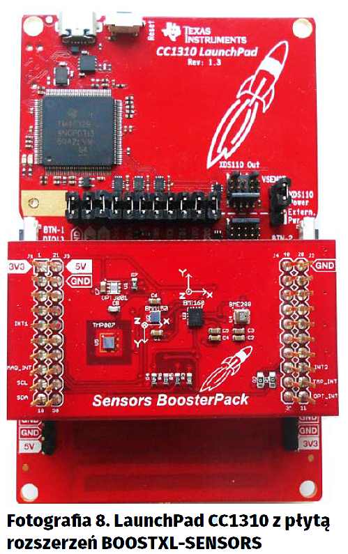 | Płyta rozszerzeń BoosterPack BOOSTXL-SENSORS jest produkowana przez Texas Instrument. Na płycie umieszczono 5 czujników cyfrowych MEMS: czujnik bezdotykowego pomiaru temperatury TMP007 (Texas Instruments), czujnik oświetlenia OPT3001 (Texas Instruments), czujnik ciśnienia atmosferycznego, wilgotności i temperatury BME280 (Bosch Sensortec), 6-osiowy (żyroskop, akcelerometr) czujnik ruchu BMI160 (Bosch Sensortec), 3-osiowy kompas BMM150 (Bosch Sensortec). Moduł rozszerzenia BOOSTXL-SENSORS jest kompatybilny z większością układów startowych LaunchPad, w tym z modułem LaunchPad dla mikrokontrolera CC1310. Cena modułu w sklepie Texas Instruments wynosi ok. 25 USD. Szczegółowe informacje o module rozszerzeń BoosterPack są dostępne na stronie https://goo.gl/FJCuzO. |