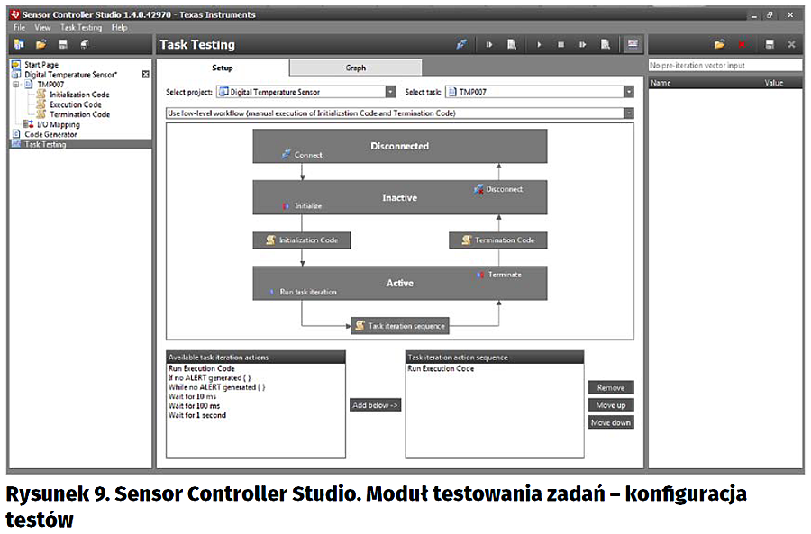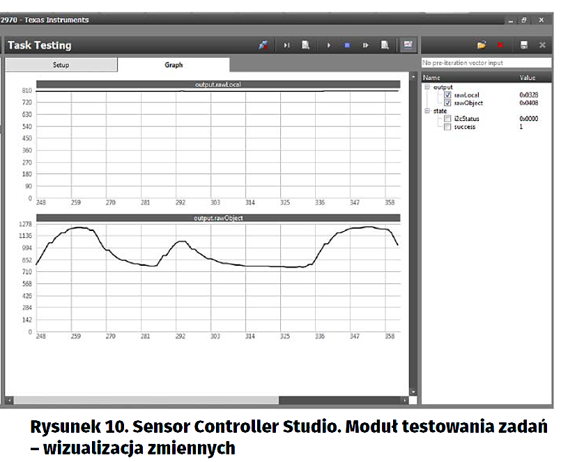 Kolejnym etapem projektu są testy utworzonego zadania. W tym celu moduł startowy LaunchPad CC1310 z zamontowana płytą rozszerzeń BOOSTXL-SENSORS przyłączamy do złącza USB komputera PC (fotografia 8). Następnie, z panelu sterowania projektu wybieramy opcję Task testing. Otwierane jest nowe okno aplikacji z zakładkami Setup (konfiguracja testów) oraz Graph (wizualizacja zmiennych). W zakładce Setup definiujemy sekwencję pracy zadania podczas testów. Wybieramy uruchomienie bloku programu z kodem wykonywalnym Execution (wybieramy opcję Run Execution Code). Ustawienia konfiguracyjne programu pokazano na rysunku 9.