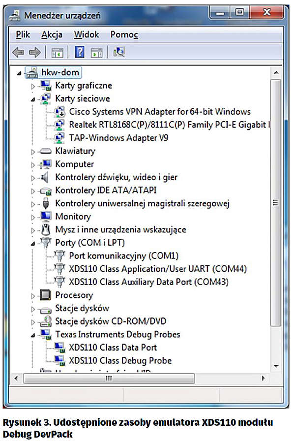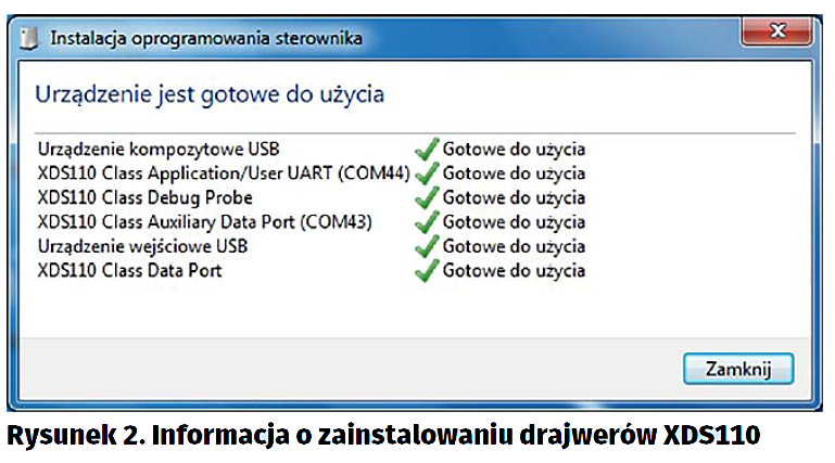Przed zainstalowaniem drajwerów emulatora XDS110 modułu Debug DevPack system operacyjny Windows pokazuje w Menagerze Urządzeń nieznane urządzenia. System Windows sam pobiera z sieci Internet i instaluje drajwery (rysunek 2). Po ich zainstalowaniu pokazywane są dwa porty COM: Application/User oraz Auxiliary Data. Pokazywane są też dwie pozycje nazywane jako „Debug/Data probe”. W środowisku programowym CCS v6x/7x moduł Debug DevPack jest dołączany jako „XDS110 USB Debug Probe” (rysunek 3). Po dołączeniu modułu Debug DevPack może się pojawić komunikat „A firmware update is required for debug probe” Należy koniecznie kliknąć na „Yes” i odczekać na potwierdzenie zakończenia aktualizacji.