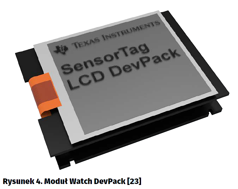 Obsługa modułu Watch DevPack z aplikacją SensorTag jest opisana na stronie Wiki TI „Display DevPack User Guide” [12]. W celu pracy należy dołączyć moduł Watch DevPack do zestawu zestawem SensorTag. Należy nałożyć na siebie gniazda DevPack Connector obu płytek i złączyć. Do zestawem SensorTag nie może być dołączony moduł Debug DevPack.