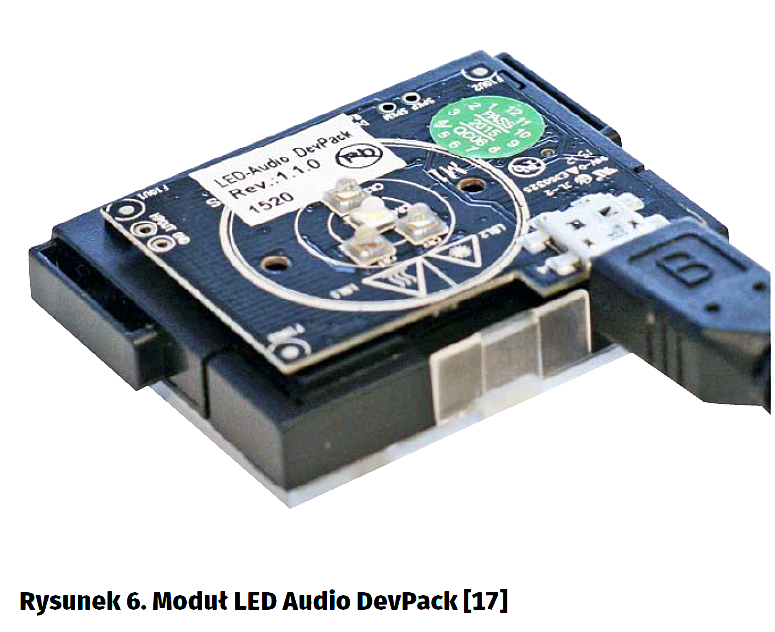 Obsługa modułu LED Audio DevPack z aplikacją SensorTag jest opisana na stronie Wiki TI „LED Audio DevPack User Guide” [13]. W celu pracy uruchomienia należy dołączyć moduł LED Audio DevPack do zestawu zestawem SensorTag. Należy nałożyć na siebie gniazda DevPack Connector obu płytek i złączyć. Następnie należy do złącza MicroUSB dołączyć kabel USB podłączony np. do gniazda USB A komputera, do ładowarki USB lub do baterii typu PowerBank.