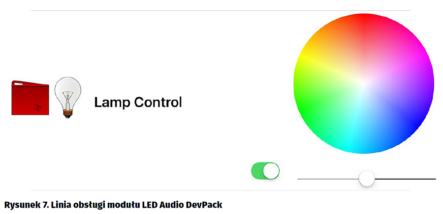 W oknie SensorView aplikacji SensorTag jest teraz dostępna linia Lamp Control. Dotykowy przełącznik włącza/wyłącza świecenie. Pozioma linia z białym okrągłym suwakiem służy do regulacji poziomu maksymalnego intensywności świecenia (aż do zupełnego wyłączenia). Koło barwne służy do ustawienia koloru sumarycznego świecenia w modelu HSL [3]. Są cztery składowe: biała, czerwona, zielona, niebieska. Cała zewnętrzna czarna linia koła barwnego odpowiada sytuacji bez świecenia diody białej. Im bliżej środka to do świecenia 3 składowych kolorowych zostaje dodane coraz więcej świecenia diody białej. Sam środek odpowiada świecenia tylko diody białej.