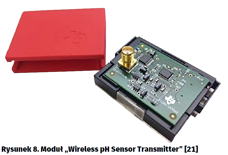 Odnośnik do projektu pomiaru pH „Wireless pH Sensor Transmitter” w formie modułu DevPack [21] znalazłem na niezależnej stronie [8]. Na jednej płytce drukowanej został zintegrowany scalony układ dedykowany LP91200 typu AFE (Analog Front End) oraz przetwornik A/C typu ADS1120. Moduł razem z zestawem SensorTag tworzy, po dołączeniu zewnętrznej sondy pH, zdalny układ pomiarowy o zakresie do 14 pH, z dokładnością 0,01 pH (rysunek 8).