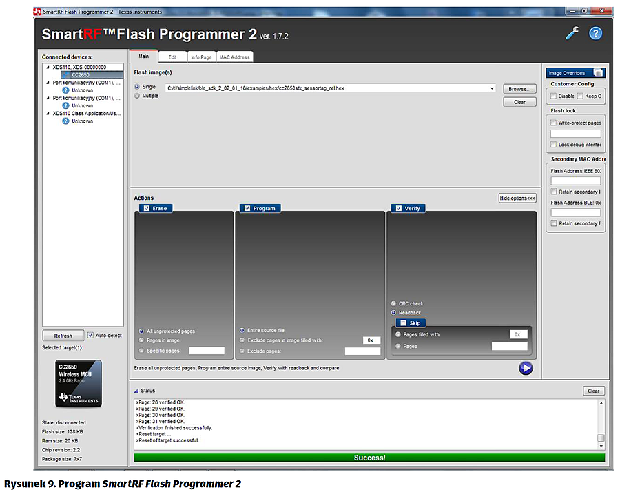 Do pracy potrzebny jest zestaw CC2650 SensorTag z dołączonym modułem rozszerzeń Debug DevPack. Zasilanie całego kompletu jest dostarczane ze złącza USB modułu Debug. Moduł Debug należy połączyć z komputerem kablem USB-A USB-Micro. Najłatwiej, programowanie zestawu CC2650 SensorTag można wykonać przy zastosowaniu na komputerze PC programu SmartRF Flash Programmer 2 [24]. Program ten pozwala na pobranie zawartości wskazanego pliku z obrazem kodu (rozszerzenie .hex) i wpisania jej do wewnętrznej pamięci Flash układu scalonego CC2650 poprzez łącze JTAG (rysunek 9).