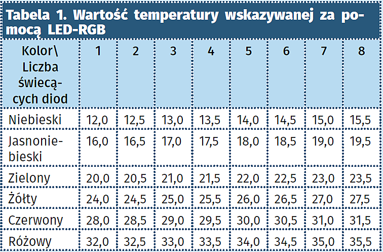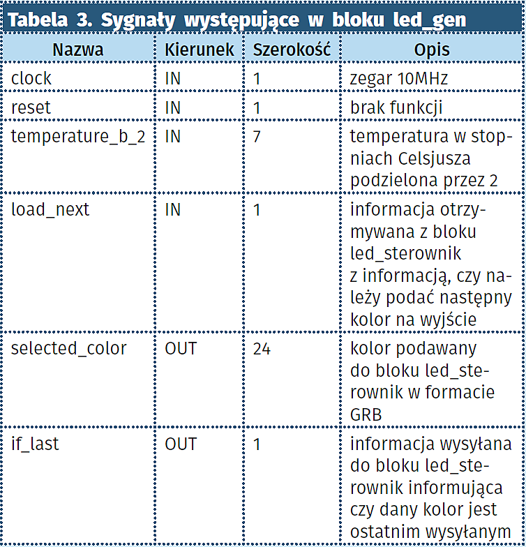 Moduł wybiera nowy kolor, kiedy sygnał load_next – pochodzący z modułu led_sterownik – jest równy 1. Na podstawie 4 najwyższych bitów wartości temperatury wejściowej temperature_b_2 określa, w jakim kolorze będzie wyświetlana temperatura. Progi kolorów wyglądają następująco: 12…15,5– ciemnoniebieski, 16…19,5– jasnoniebieski, 20…23,5 – zielony, 24…27,5 – żółty, 28…31,5 – czerwony, 32,0…35,5 – różowy. Kod koloru jest zapisywany do sygnału temp_color. Na podstawie wartości 3 najmłodszych bitów ustalane jest, ile z ośmiu diod modułu KAmodWS2812-8 powinno być włączonych. Dla wartości 0 jest to 1 dioda. Kiedy na 3 najmniej znaczących bitach w sygnale temperature_b_2 są same jedynki, to włączone są wszystkie diody.