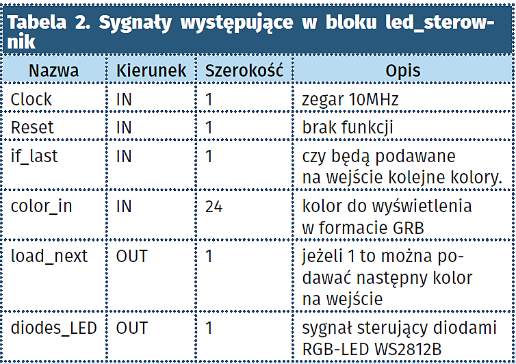 Kody kolorów są wysyłane jeden po drugim. Licznik count_diodes odlicza, ile kolorów diod powinno być jeszcze wysłanych i ustala na wyjściu selected_color wartość temp_color, jeżeli dioda ma się świecić lub same zera, jeżeli dioda nie powinna się świecić. Po ośmiu kolorach licznik count_diodes przyjmuje wartość 8 i ustawia bit if_last, który sygnalizuje, że więcej kolorów nie będzie wysyłanych.