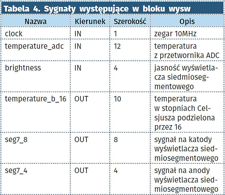 wysw (tabela 4). Moduł wysw jest odpowiedzialny za konwertowanie temperatury z przetwornika A/C do zadanych formatów oraz wyświetlaniu jej na wyświetlaczu siedmiosegmentowym. W module występuje sygnał slow_clk, który jest inkrementowany przy każdym zboczu narastającym zegara. Służy on jako wejście ‚clock enable’ do wyzwalania procesów, które należy włączać z dużo mniejszą częstotliwością niż częstotliwość głównego sygnału zegarowego.