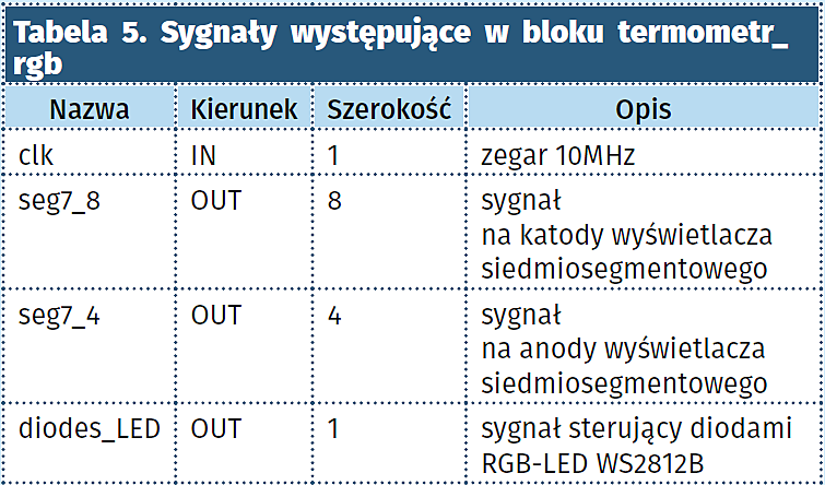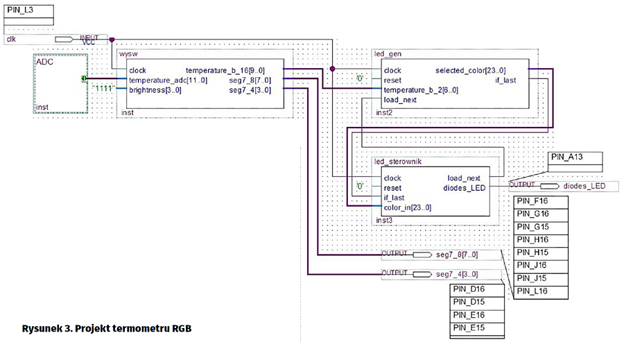 termometr_rgb (tabela 5). Najwyżej położony w hierarchii moduł opisowy w VHDL, łączy wszystkie wyżej wymienione modułu oraz zawiera przetwornik ADC, który pobiera wartość z pinu wejścia analogowego numer 0. Jest on podłączony do kanału 15. Przetwornik zawiera moduły adc, fingertemp_adc_sequencer oraz pętlę pll generującą zegary na podstawie zegara wejściowego 10 MHz. Wartość z przetwornika jest zapisywana do sygnału counter, który jest wysyłany do bloku wysw. Blok ten zwraca sygnały, które są kierowane na piny do obsługi wyświetlacza siedmiosegmentowego oraz przekazuje sygnał z informacją o temperaturze do bloku led_gen. Blok ten przekazuje i dobiera sygnały z bloku led_sterownik, który na podstawie otrzymanej wartości koloru tworzy sygnał diodes_LED, który jest wyprowadzony na pin do sterowania diodami RGB.