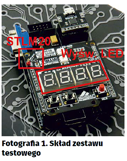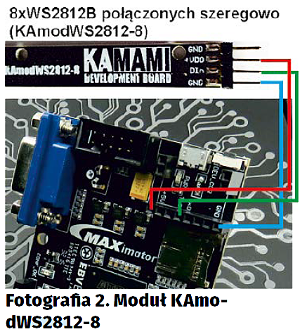 W odróżnieniu od wcześniej prezentowanych projektów, projekt prezentowany w artykule wymaga dołączenia nie tylko shielda maXimator Expander (na którym umieszczono wyświetlacze LED oraz sensor temperatury STLM20 – fotografia 1), ale także linijki z 8 diodami LED-RGB WS2812B. W przykładzie użyto modułu KAmodWS2812-8, który dołączono do układu FPGA za pomocą pinów UART-a (fotografia 2):