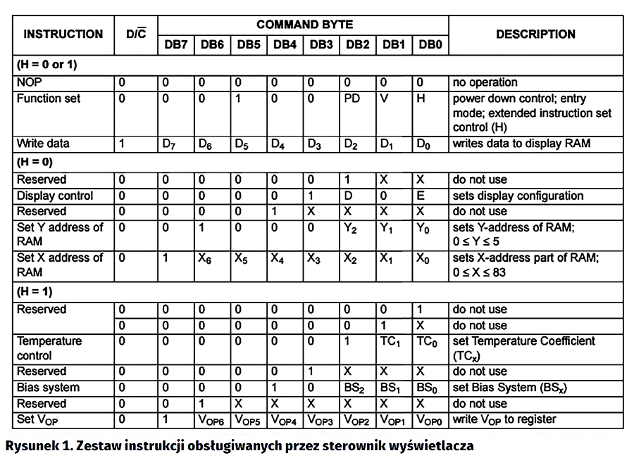 Na rysunku 1 pokazano tabelę zaczerpniętą z dokumentacji sterownika. Znajduje się w niej spis rozkazów obsługiwanych przez sterownik wraz z ich strukturą binarną. Polecenia podzielono na dwie grupy – zestaw poleceń rozszerzonych (H=1) oraz podstawowych (H=0). Za pomocą poleceń rozszerzonych konfigurujemy sterownik do pracy z konkretną matrycą. Polecenia podstawowe dotyczą trybu wyświetlania, sposobu transmisji danych do wyświetlacza oraz położenia „kursora”. Są też częściej wykorzystywane w trakcie pracy z wyświetlaczem.