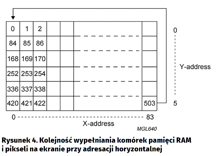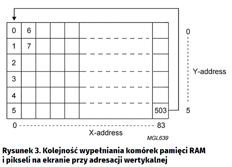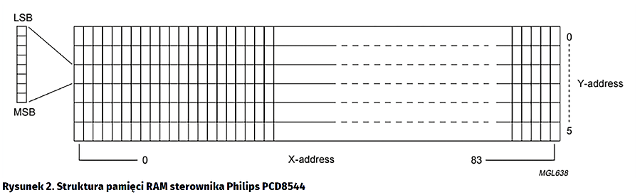 Dane przesyłane do sterownika trafiają do pamięci RAM (rysunek 2), a następnie „na matrycę”. Pamięć podzielono na 6 segmentów, które wybieramy, ustawiając adres poziomy (liczbę z zakresu 0…5) oraz pionowy, tj. liczbę z zakresu 0…83. Transmitując bajt danych (8 bitów), przesyłamy mapę bitową paska o wysokości 8 pikseli, umieszczanego pod wskazanym adresem oraz rysowanego w odpowiadającym mu miejscu na wyświetlaczu. Każdy bit, odpowiada jednemu pikselowi – logiczna „1” powoduje, że piksel będzie zaczerniony, a logiczne „0”, że przezroczysty. Najbardziej znaczący bit tego bajtu danych opisuje skrajnie dolny punkt paska.