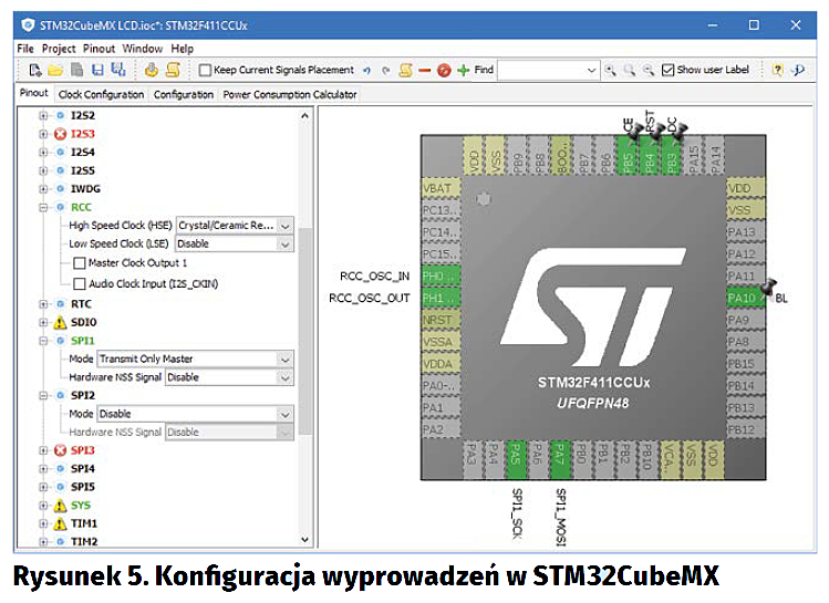 Aby ustawić wyprowadzenie procesora w tryb pracy „GPIO Output”, klikamy prawym przyciskiem na jego rysunek i z listy wybieramy stosowną pozycję. Polecam przy okazji nadać pinom nazwy, takie jak na rysunku 5. Ułatwi to ich późniejszą identyfikację oraz użycie w kodzie programu. Interfejs SPI konfigurujemy, rozwijając dowolny interfejs „SPIx” na liście po lewej stronie okna programu i z listy rozwijanej „Mode” wybierając opcję „Transmit Only Master”. Dokładne znaczenie tej opcji przedstawione zostało w poprzedniej części serii. Jeśli nasza płytka rozwojowa lub prototypowa ma oscylator kwarcowy (tak jak KA–NUCLEO–F411CE), włączamy jego użycie poprzez rozwinięcie, na liście po lewej stronie okna, pozycji „RCC” i ustawienie, w polu „High Speed Clock (HSE)”, wartości „Crystal/Ceramic Resonator”.