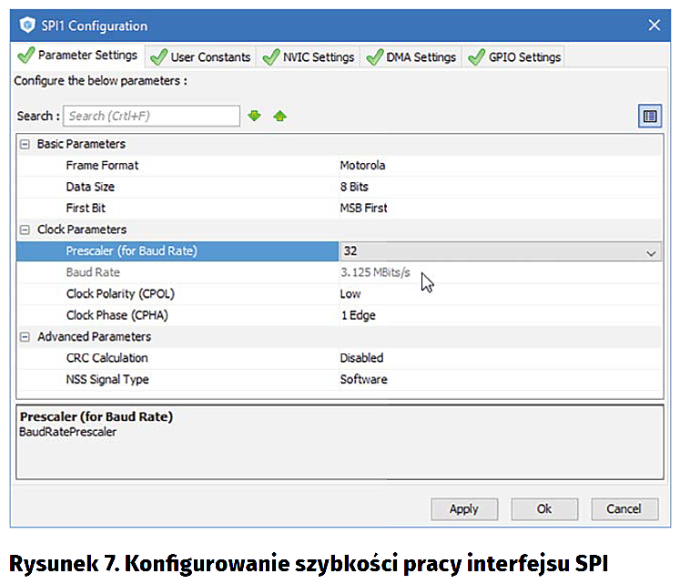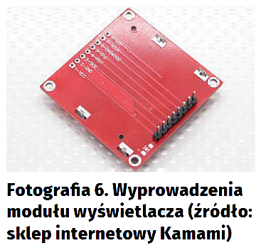 Na fotografii 6 pokazano wyprowadzenia modułu wyświetlacza. Ich znaczenie zostało już wyjaśnione wcześniej. Teraz potrzebujemy jedynie pamiętać, że wyprowadzenia procesora przyłączone do pinów BL, CE, RST i DC powinny być skonfigurowane jako „GPIO Output”. Piny DIN i CLK to wyprowadzenia interfejsu SPI – odpowiednio MISO oraz SCK.
