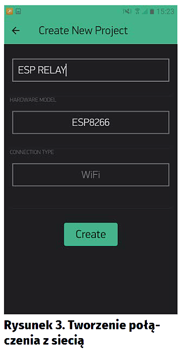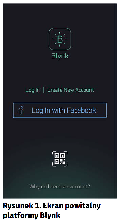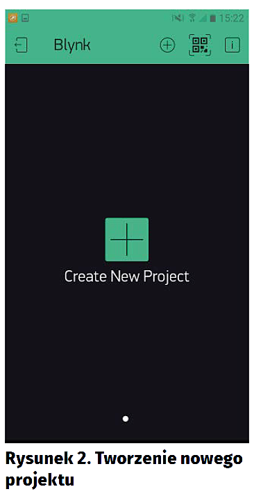 Pobieramy Blynka z GooglePlay lub iOS Store i uruchamiamy. Przywita nas okno jak na rysunku 1. Zakładamy nowe konto lub, jeśli już je posiadamy, logujemy się na nie. Po zalogowaniu się jest wyświetlana lista utworzonych projektów – mamy też możliwość tworzenia nowych. Będzie to nasz pierwszy projekt, więc klikamy Create New Project (rysunek 2). Nadajemy nazwę naszemu projektowi, wybieramy platformę sprzętową oraz to, w jaki sposób łączymy się z siecią, a następnie Create (rysunek 3).