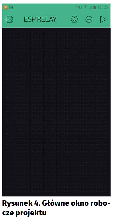 Otworzy się główne okno robocze projektu pokazane na rysunku 4. W lewym górnym rogu mamy ikonkę powrotu. W prawym górnym kolejno: ustawienia (ikonka nakrętki), dodanie nowej kontrolki (ikonka plusa w kółeczku) poprzez Widget Box oraz uruchomienie (znaczek play). Poniżej widnieje przestrzeń robocza – to tu będziemy układać potrzebne nam komponenty.