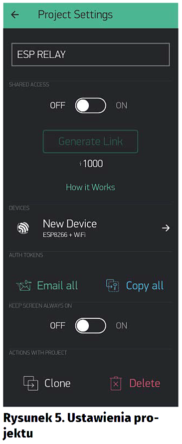 Zapoznajmy się z ustawieniami – rysunek 5. W pierwszej sekcji możemy zmienić nazwę projektu. Następnie mamy opcję odnośnie do współdzielenia projektu z innymi osobami i możliwość wygenerowania linku do tego celu. Kolejną opcją jest zmiana platformy sprzętowej. Poniżej możemy wysłać na e-mail podany przy zalogowaniu klucz autoryzacyjny. Każdy projekt ma swój unikalny kod, który musimy także podać w programie – to z jego użyciem aplikacja komunikuje się z urządzeniem. Ten klucz jest jednocześnie zabezpieczeniem, że nikt nieuprawniony nie będzie wysyłał komunikatów w naszym imieniu. Mamy też możliwość ustawienia, aby ekran telefonu/tabletu nie wyłączał się automatycznie. Daje to możliwość zamontowania tabletu w łatwo dostępnym miejscu, jako panel sterowania inteligentnym domem. Ostatnie opcje to klonowanie projektu na inne urządzenie oraz możliwość jego usunięcia.