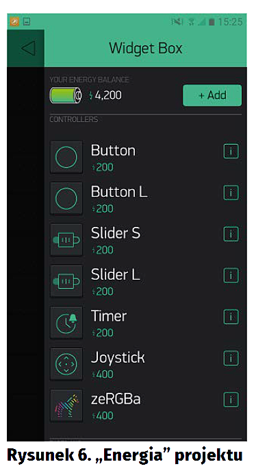 Na górze okna (rysunek 6) widzimy naszą „energię”. Blynk niestety nie jest całkowicie darmową aplikacją, każdy komponent kosztuje nas określoną ilość „energii”. Po jej wyczerpaniu nie możemy dodać ich więcej, a „energię” można dokupić. Nie znika ona jednak po skasowaniu kontrolki, a jest oddawana. Domyślnie mamy 4200 jednostek energii – wystarczy to w zupełności do średnio skomplikowanych projektów i żeby zapoznać się z platformą. Poniżej widzimy dostępne kontrolki wraz z ceną energii za ich użycie i ikonką informacji – po jej wciśnięciu wyświetli się dokładna instrukcja użytkowania wraz z przykładowymi kodami itp. Opis wartych uwagi komponentów znajduje się na końcu artykułu.