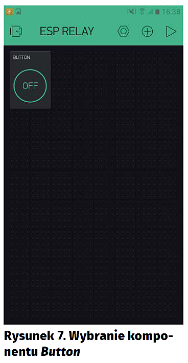 Ustalmy teraz, jaki cel chcemy osiągnąć – w ESP RELAY mamy dostępne 4 przekaźniki, więc utwórzmy 4 przyciski do sterowania nimi. Z Widget Boxa wybieramy Button – jest on wyświetlany na obszarze roboczym, jak pokazano na rysunku 7. Klikamy w niego, aby przejść do ustawień – widzimy je na rysunku 8. Możemy: