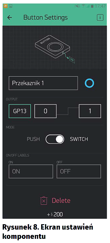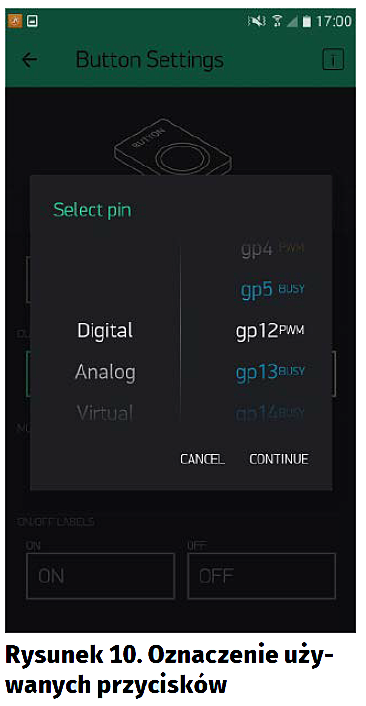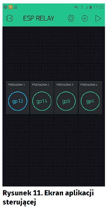 W ESP RELAY korzystamy kolejno z wyprowadzeń o numerach: 13, 14, 5, 4. Ustawienia pierwszego przycisku wykonujemy w sposób pokazany na rysunku 8. Resztę analogicznie, ale z innymi wyprowadzeniami. Warto zauważyć, że Blynk nie pozwoli nam na przypisanie jednego doprowadzenia I/O do kilku przycisków – te zajęte zostaną oznaczone będą „busy” (zajęte), jak pokazano na rysunku 10. Po dodaniu przycisków dla wszystkich kanałów i ich przemieszczeniu otrzymamy efekt pokazany na rysunku 11.