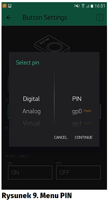 - Przypisać, czym ma on sterować, klikamy PIN i otwiera się nowe menu, jak na rysunku 9. Tutaj mamy 3 główne kategorie: