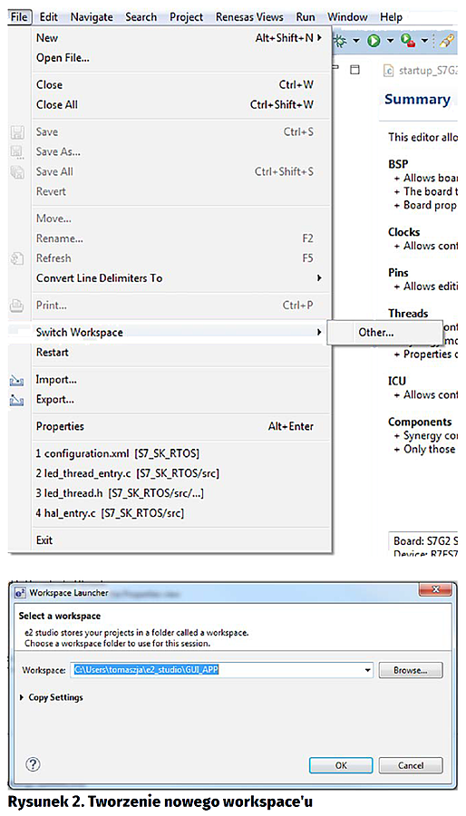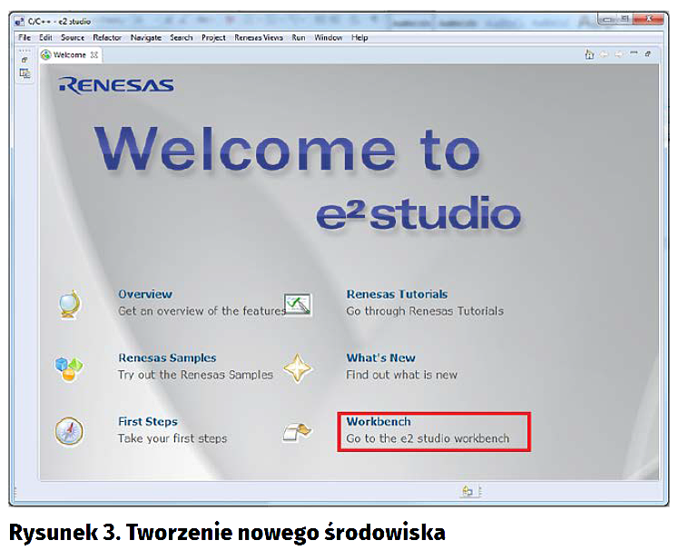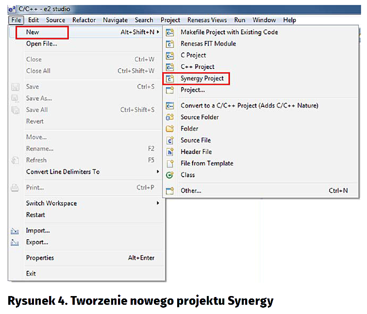 Pracę zaczynamy od utworzenia i wstępnego skonfigurowania nowego projektu w środowisku e2studio. W tym momencie zakładamy, że e2studio zostało wcześniej skonfigurowane do wspierania projektów utworzonych za pomocą Synergy i że zainstalowano kompilator GCC ARM Embeded z plikiem licencji. Ponadto ze strony Renesasa trzeba pobrać i zainstalować pakiet Synergy Software Package SSP. Te czynności zostały opisane w artykule na temat e2studio.