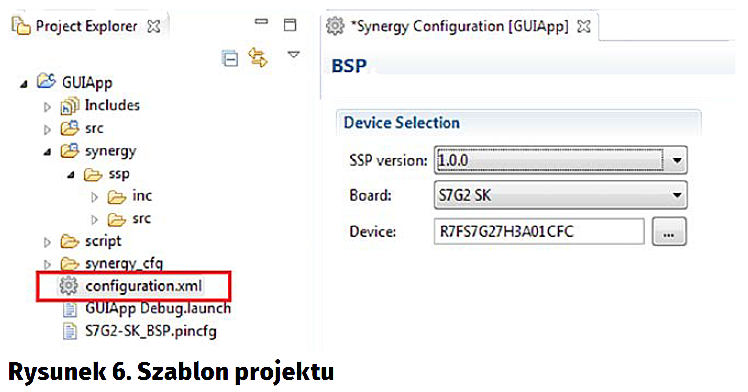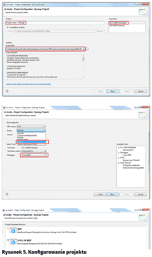 Nowy projekt musi być spersonalizowany: trzeba mu nadać nazwę – niech to będzie GUIApp. Następnie należy wybrać kompilator (GCC ARM Embeded) oraz podać ścieżkę dostępu do jego pliku licencji (jeśli nie zrobiono tego wcześniej). W kolejnym kroku z listy wspieranych modułów ewaluacyjnych wybieramy S7G2 SK oraz debugger J-Link ARM. W konfiguracji wybieramy opcję S7G2-SK BSP (rysunek 5) Konfigurator utworzy szablon projektu pokazany na rysunku 6.