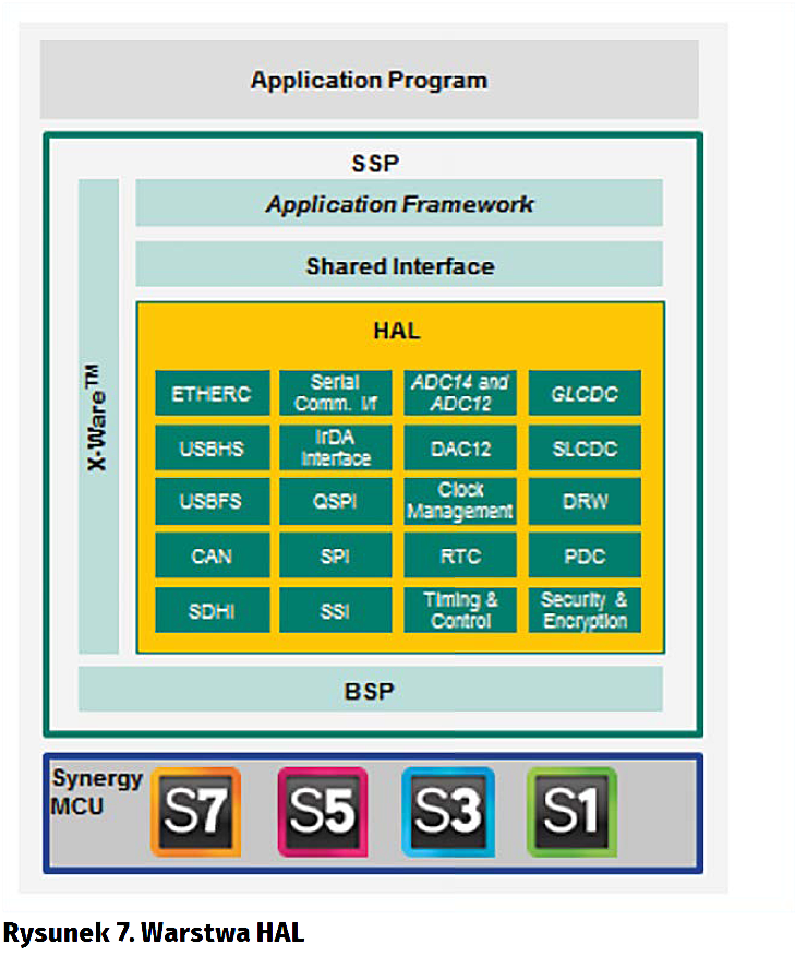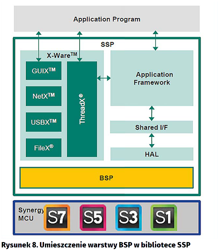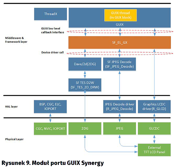 Projekt interfejsu będzie się opierał na module portu GUIX Synergy umieszczonego w warstwie framework biblioteki SSP. Moduł portu i jego współpraca z warstwami niższymi HAL i warstwą fizyczną został schematycznie pokazany na rysunku 9. Port umożliwia współpracę aplikacji Express Logic GUIX z warstwami Framework i niższymi.