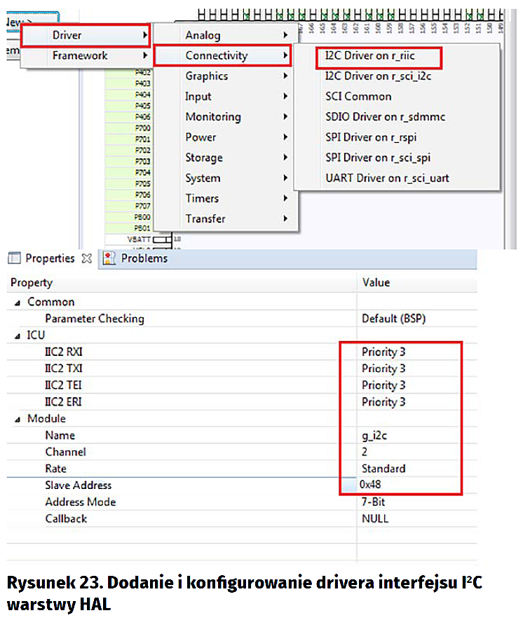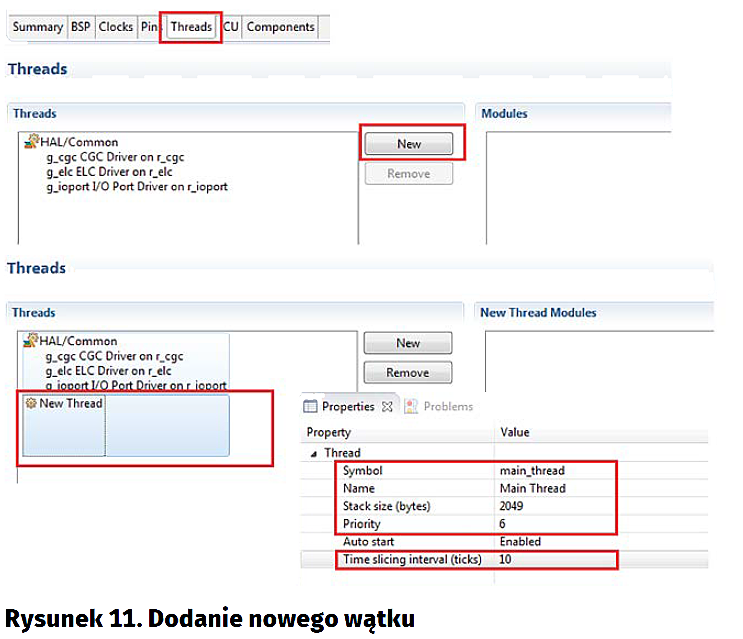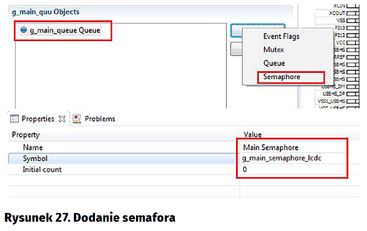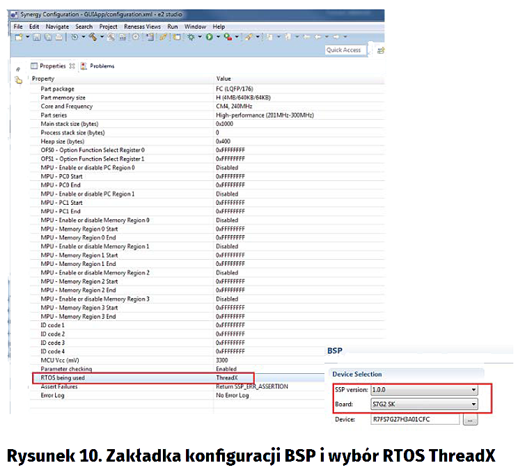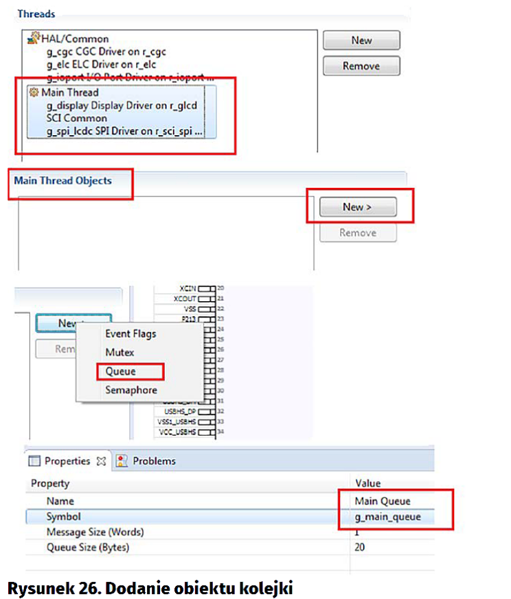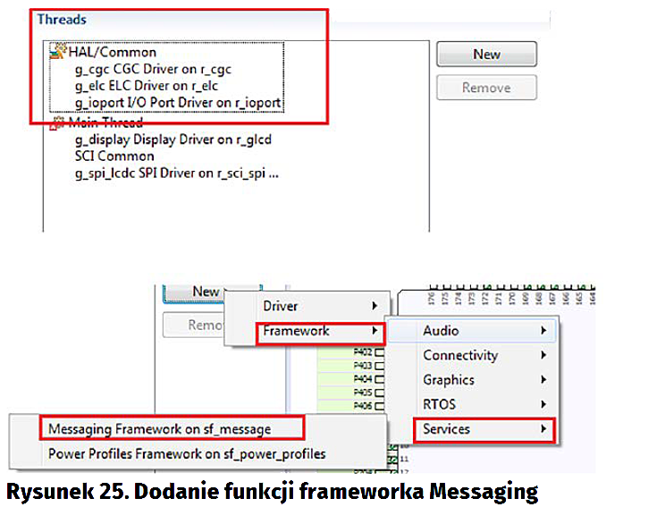 Na tym kończymy dodawanie i konfigurowanie funkcji drivera i frameworka biblioteki SSP niezbędnych do działania naszej aplikacji i przechodzimy do konfigurowania interfejsów komunikacyjnych i wyprowadzeń mikrokontrolera niezbędnych do poprawnego działania warstwy BSP. Na kolejnych rysunkach są pokazane kroki niezbędne do pracy systemu RTOS (rysunki 25, 26 i 27).