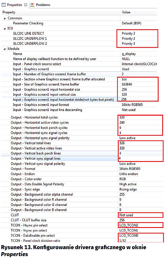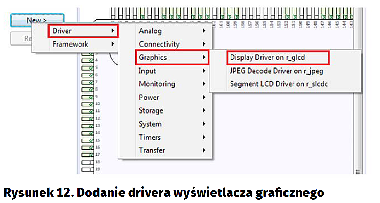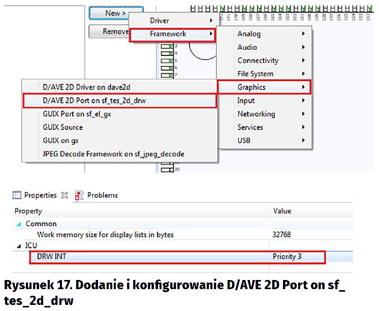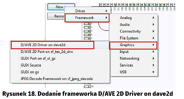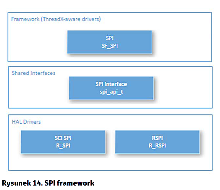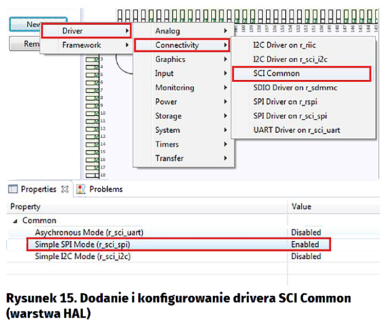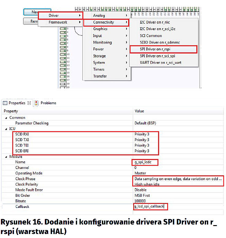 Użycie systemu RTOS powoduje, że przesyłanie danych z/do sterownika wyświetlacza wymaga implementacji specjalnych funkcji komunikacyjnych. W tym wypadku będą to drivery i funkcje API interfejsu SPI. Strukturę interfejsu SPI Framework pokazano na rysunku 14. Jako pierwszy dodajemy driver komunikacji sterownika wyświetlacza z mikrokontrolerem (warstwa HAL). Jak poprzednio, w oknie Main Thread Modules dodajemy moduł New -> Driver -> Connectivity -> SCI Common (rysunek 15), a następnie New -> Driver -> SPI Driver on r_rspi. Dodanie tego ostatniego oraz jego konfigurację pokazano na rysunku 16. W kolejnych dwóch krokach dodajemy framework i driver D/AVE 2D warstwy framework (rysunki 17 i 18).