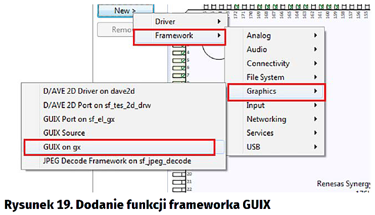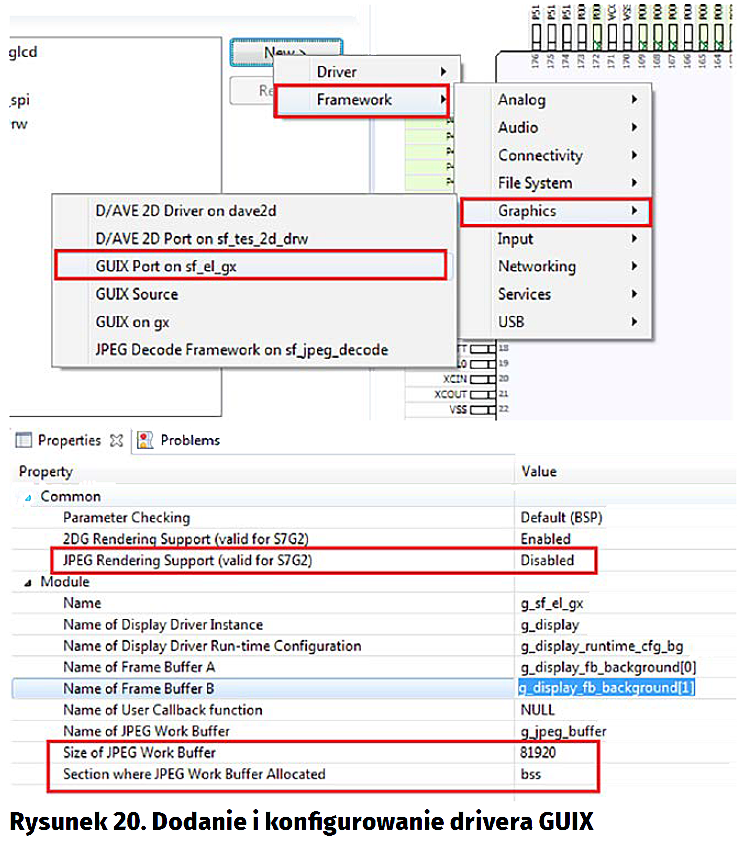 Jak wspomniano, obsługę interfejsu graficznego zapewnia w bibliotece SSP port GUIX. GUIX zawiera procedury zapewniające wsparcie projektowania interfejsów graficznych za pomocą zewnętrznego narzędzia GUIX Studio – programu dla komputera PC pozwalającego na szybkie projektowanie ekranów interfejsu graficznego z dodawaniem widżetów i przypisywanie im akcji w połączeniu z obsługą ekranu dotykowego. Dodanie funkcji framework GUIX oraz ich konfigurację pokazano na rysunkach 19 i 20.