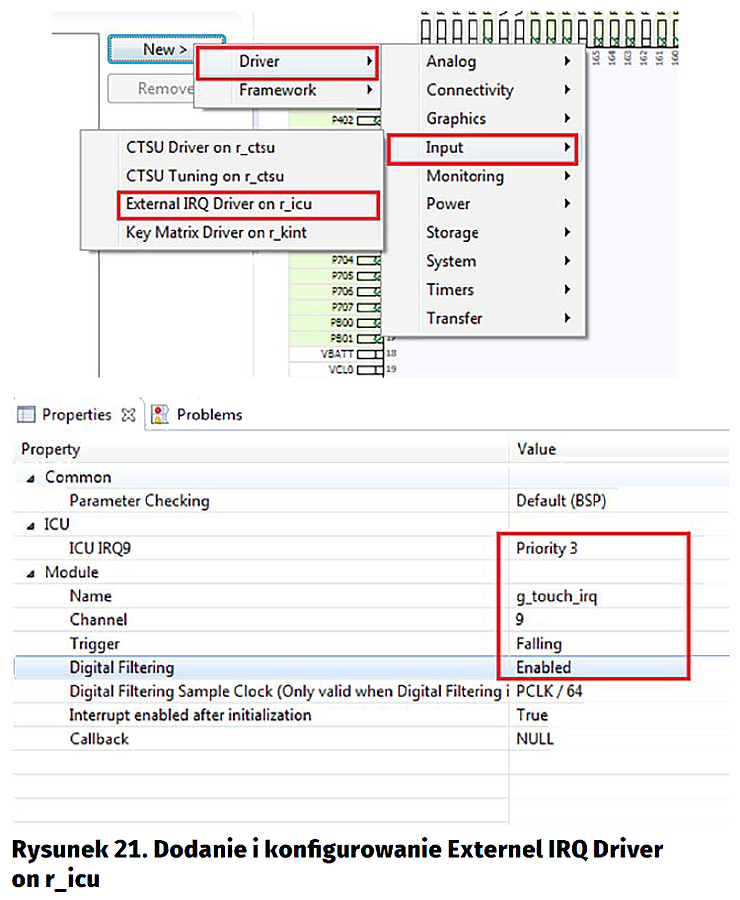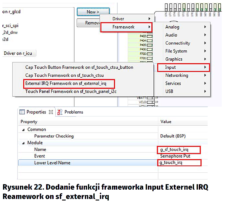 W kolejnych krokach trzeba dodać funkcje do obsługi interfejsu dotykowego, do którego obsługi będzie używane przerwanie zewnętrzne. Interfejs dotykowy jest oparty na układzie scalonym SX8656. Zmiana stanu czujnika dotykowego generuje sygnał przerwania IRQ94, a mikrokontroler przez interfejs I2C musi odczytać nowy stan czujnika. Żeby obsłużyć przerwanie zewnętrzne i aby to przerwanie mogło synchronizować działanie wątków RTOS, trzeba dodać funkcje drivera i funkcje framework do obsługi zewnętrznego przerwania IRQ, jak na rysunkach 21 i 22.