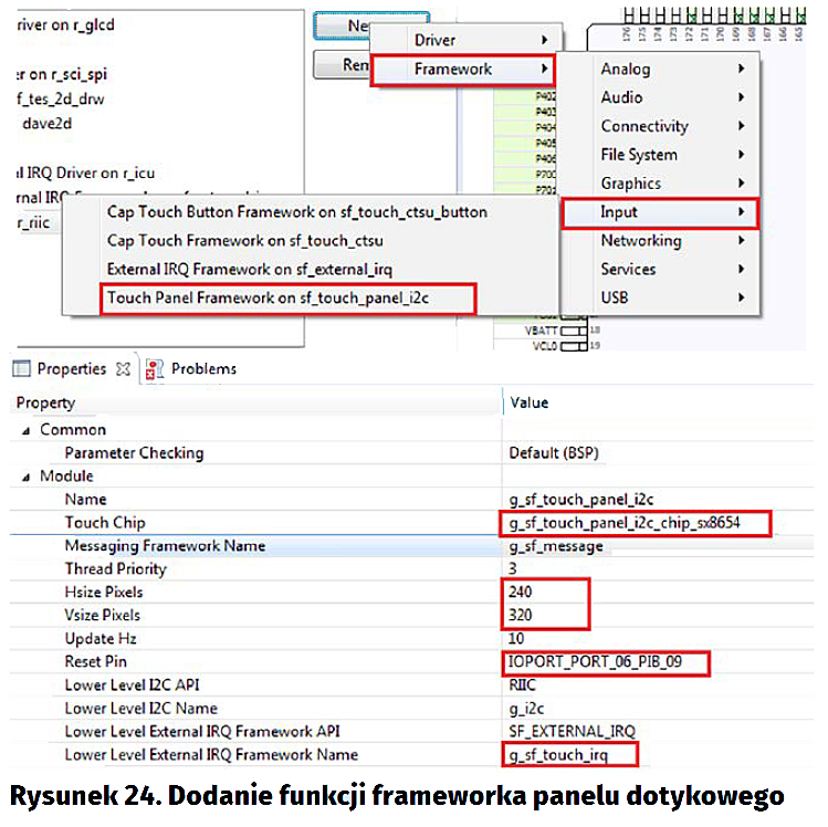 Następnie dodajemy funkcje warstwy HAL do obsługi interfejsu I2C. We właściwościach drivera podajemy adres slave 0x48 układu kontrolera panelu dotykowego SX8656. Przy zmianie wszystkich pól name (nazwa) trzeba bardzo dokładnie wpisać nazwy modułów, bo potem do tych nazw będziemy się odnosili w funkcjach warstwy wyższej. Po dodaniu i konfiguracji funkcji obsługi przerwania zewnętrznego i interfejsu I2C trzeba dodać funkcje framework do obsługi panelu dotykowego. We właściwościach podajemy parametry, które będą potrzebne warstwie BSP: rozdzielczość pionową i poziomą w pikselach oraz pin mikrokontrolera przyłączony do zerowania sterownika panelu.
