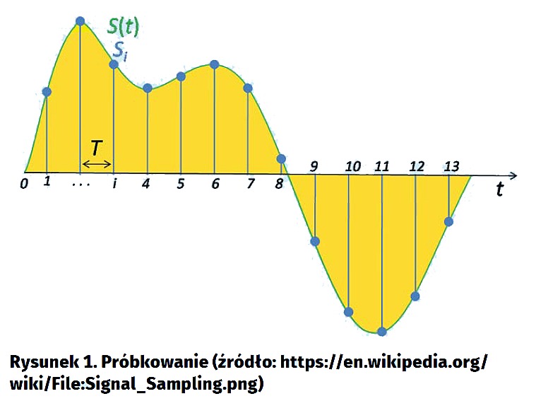 Ponieważ poziom napięcia stale zmienia się w czasie, aby umożliwić jego zapis cyfrowy, należy pobrać w określonych odstępach czasowych jedną lub więcej próbek, czyli wartości napięcia w konkretnych chwilach (rysunek 1). Jeśli korzystamy z przetwornika A/C do zapisu fali akustycznych lub innych sygnałów zmiennych w czasie, zgodnie z prawem Shannona sygnał taki musimy próbkować z częstotliwością równą co najmniej dwukrotności maksymalnej częstotliwości występującej w przetwarzanym sygnale.