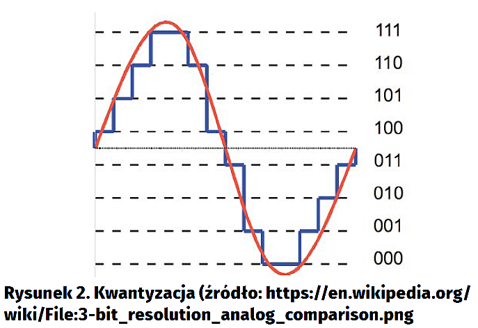 Po próbkowaniu zapis sygnału wciąż nie jest jednak cyfrowy. Poziomy napięć w próbkach nadal są analogowe i mają nieskończoną precyzję. Dlatego procesowi próbkowania zawsze towarzyszy proces kwantyzacji, czyli przypisania wartościom napięcia z pewnego zakresu możliwie najbliższych im wartości cyfrowych, zapisanych w postaci liczb binarnych ze stałą precyzją (rysunek 2). Przykładowo, liczb z zakresu od 0 do 4095 dla napięcia z zakresu 0,0…3,3 V, gdzie 0 odpowiada napięciu 0 V, a 4095 – 3,3 V.