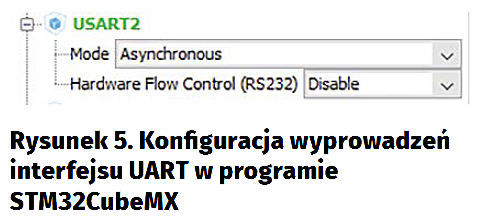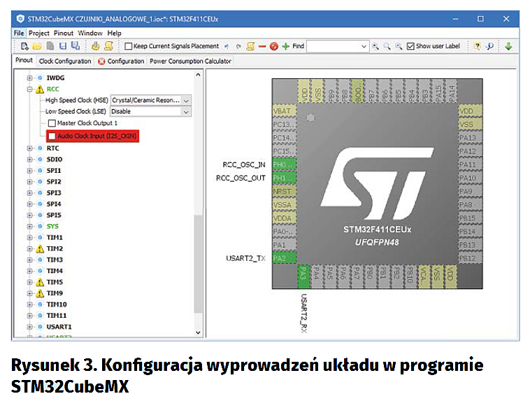 Na pierwszej planszy głównego okna programu CubeMX – „Pinout”, podobnie jak w poprzednich częściach, z listy po lewej stronie rozwijamy pozycję „RCC” i z pola „High Speed Clock (HSE)” wybieramy opcję „Crystal/Ceramic Resonator” (rysunek 3).