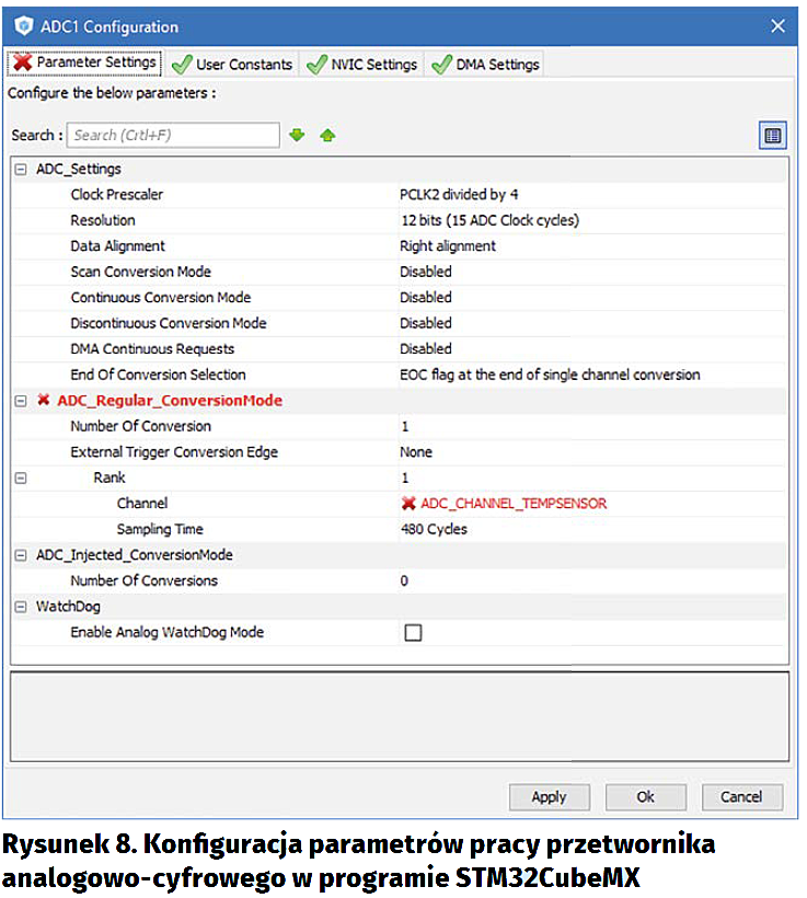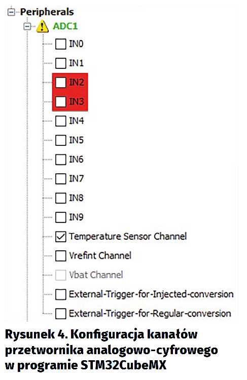 Następnie rozwijamy pozycję ADC1 i zaznaczamy na liście jedynie pozycję „Temperature Sensor Channel” (rysunek 4). Na tej liście znajdują się wszystkie kanały wejściowe pierwszego i jedynego (w przypadku tego konkretnego układu) konwertera cyfrowo-analogowego. Pozycje od IN0 do IN9 odpowiadają wyprowadzeniom układu – odpowiednio PA0-PA7 oraz PB0 i PB1. Jeśli zostaną zaznaczone, na tych pinach będzie możliwy odczyt analogowych wartości przyłożonych napięć pomiędzy danym pinem a wspólną masą. „Temperature Sensor Channel”, „Vrefint Channel”, „Vbat Channel” to kanały wewnętrzne – przyłączone do wbudowanych w układ czujników bądź punktów pomiarowych. „Temperature Sensor Channel” to kanał wbudowanego termometru. „Vrefint Channel” to kanał napięcia referencyjnego, stabilizowanego wewnątrz układu. Za jego pomocą dokonywane są pozostałe pomiary. „Vbat Channel” umożliwia pomiar napięcia zasilania. W tym przykładzie jest wykorzystany wbudowany termometr, zasada wykonywania pomiarów jest jednak identyczna, również w przypadku pozostałych, w tym zewnętrznych czujników.