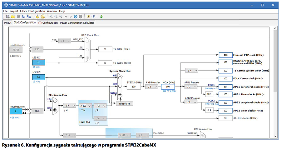 Przechodzimy do kolejnej planszy – „Clock Configuration” i ustawiamy na niej parametry tak, jak w poprzednich częściach. W pole „HSE – Input Frequency” wpisujemy wartość częstotliwości zewnętrznego oscylatora kwarcowego podłączonego do układu. Na płytce KA-NUCLEO–F411CE jest to 8 MHz. Z pola „PLL Source Mux” wybieramy opcję „HSE”, z pola „System Clock Mux” – „PLLCLK”. W pole „HCLK” wpisujemy wartość maksymalną częstotliwości taktowania obsługiwanej przez nasz układ (u mnie 100 MHz). Dokładne znaczenie tych parametrów zostało omówione w pierwszej części cyklu (rysunek 6).