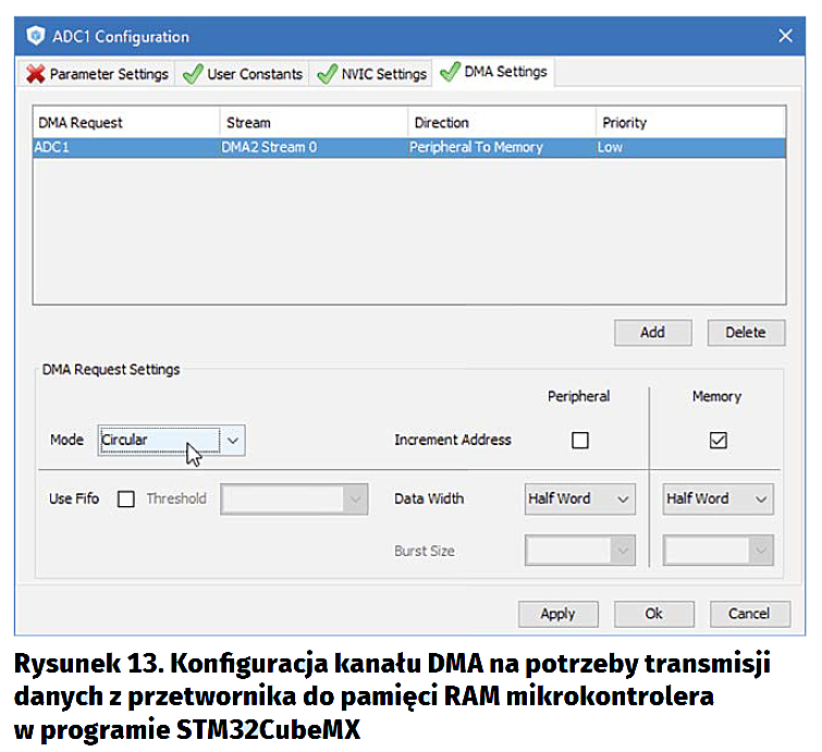 Uruchamiamy program STM32CubeMX, nawigujemy do zakładki „Configuration” i otwieramy ustawienia przetwornika ADC1. W polach „Contignous Conversion Mode” oraz „DMA Contignous Request” ustawiamy wartości „Enabled”. Włączenie opcji „Contignous Conversion Mode” powoduje, że po zakończeniu pomiaru przetwornik automatycznie rozpocznie kolejny. Opcja „DMA Contignous Request” powoduje, że po każdym pomiarze uzyskana wartość będzie zapisywana do pamięci (rysunek 12).