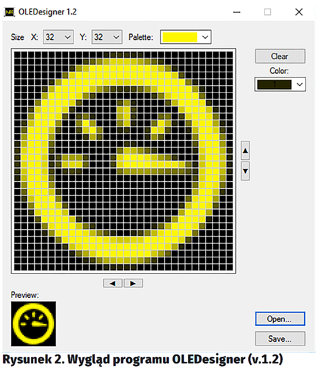 Teraz z kolei, przedstawię funkcję pozwalającą wyświetlać proste grafiki ekranowe. Jako, że zgodnie z tym, co napisano powyżej, sterownik SSD1327 ma dość nietypową organizację pamięci ekranu, do przygotowania tablic zawierających przeznaczone do wyświetlenia grafiki niezbędne okazało się wykorzystanie specjalistycznego oprogramowania. W tym celu posłużono się najnowszą wersją programu OLEDesigner (v.1.2), którego autorem jest Marcin Popławski. Jest to, co oczywiste, jedno z możliwych rozwiązań tego problemu, lecz moim zdaniem na tyle uniwersalne, komfortowe i łatwe w użyciu, iż może być podstawowym narzędziem dla monochromatycznych wyświetlaczy OLED o takiej organizacji pamięci obrazu. Wygląd okna najnowszej wersji programu OLEDesigner przedstawiono na rysunku 2. Za pomocą tego łatwego w użyciu, ale jakże użytecznego narzędzia, jesteśmy w stanie zaprojektować dowolny element przyszłego interfejsu użytkownika projektowanego urządzenia. Co więcej, bieżąca wersja programu obsługuje następujące formaty danych: