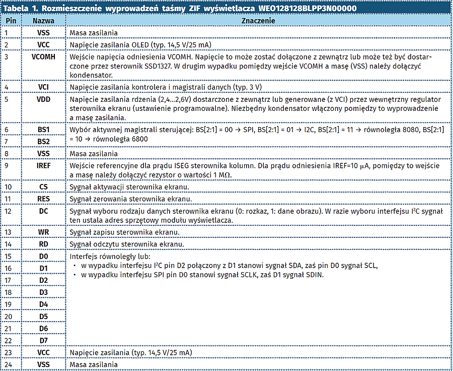 Niezależnie od wszystkiego, tak, czy inaczej, zacząć musimy od bohatera naszego artykułu – modułu wyświetlacza OLED typu WEO128128BLPP3N00000. Jest to wyświetlacz o białym kolorze pikseli, wyposażony w giętką, 24-wyprowadzeniową taśmę FPC przeznaczoną do wsunięcia w gniazdo ZIF o rastrze wyprowadzeń 0,5 mm. Rozkład i opis wyprowadzeń umieszczono w tabeli 1. Zgodnie z tym, co napisano i o czym można się przekonać spoglądając na tab. 1, nowe wyświetlacze z rodziny WEO128128B mają kilka rodzajów interfejsów sterujących, jednak z uwagi na fakt, iż w naszym docelowym systemie mikroprocesorowym nie dysponujemy bardzo szybkim mikrokontrolerem posłużymy się równoległym, 8-bitowym interfejsem danych/rozkazów sterujących, dla którego piny BS[2:1] wyświetlacza powinny zostać połączone z napięciem zasilania. Tego typu rozwiązanie pozwoli na osiągnięcie maksymalnej szybkości transmisji danych, co przełoży się na szybkość rysowania grafik ekranowych. Co więcej, zastosujemy jeszcze dwie inne „sztuczki” sprzętowe, które w dalszym stopniu przyczynia się do zwiększenia wspomnianej prędkości transmisji. Po pierwsze, sygnał wyboru sterownika ekranu CS podłączymy na stałe z masą zasilania aktywując sterownik SSD1327, przez co funkcje odpowiedzialne za transmisję danych nie będą musiały obsługiwać tego sygnału. Po drugie, przyjmiemy, że stanem spoczynkowym sygnału wyboru rodzaju danych DC będzie logiczna jedynka, co oznacza, że przesyłane dane są domyślnie danymi treści obrazu. To pozwoli na dalsze przyspieszenie stosownych funkcji graficznych. Nasza biblioteka nie będzie również obsługiwać sygnału odczytu magistrali sterującej RD, gdyż nie korzystamy w niej z możliwości odczytu danych ze sterownika ekranu. Sygnał ten będzie stale logiczną jedynką.
