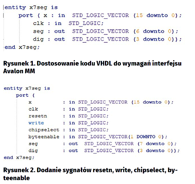 W projekcie użyjemy interfejsu Avalon MM oraz projektu z EP 12/2016 Pierwsze kroki z FPGA (6) MAXimator jak Arduino. Pierwszy krok to dostosowanie kodu VHDL do wymagań interfejsu Avalon MM (rysunek 1). Trzeba dodać kilka sygnałów: resetn, write, chipselect, byteenable, jak na rysunku 2.