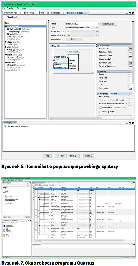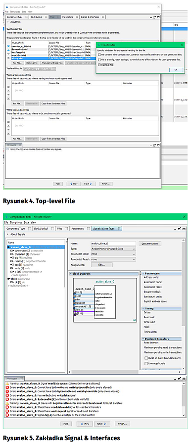 Przygotowałem obsługę wyświetlacza w VHDL-u – cały program jest dostępny w materiałach dodatkowych do projektu. Zawartość należy rozpakować w dowolnym miejscu, najlepiej w katalogu projektu NIOS_LED. Następnie uruchamiamy Quartusa, wybieramy projekt NIOS_LED, rozbudujemy go o obsługę wyświetlacza LED. Uruchamiamy Qsys, otwieramy NIOS_LED.qsys. W okienku IP Catalog dwukrotnie klikamy na New Component... (rysunek 3). W polu Name i Display name wpisujemy dowolną nazwę komponentu, ja wybrałem hex7led. Przechodzimy do zakładki Files, w sekcji Synthesis Files klikamy Add File… Przechodzimy do katalogu, w którym mamy rozpakowany plik 7seg_AVALON.7zip i dodajemy wszystkie pliki. Na pliku x7seg.vhd klikamy w kolumnie Attributes i wybieramy Top-level File (rysunek 4). Klikamy Analyze Synthesis Files oraz w sekcjach Verilog Simulation Files i VHDL Simulation Files na przycisk Copy from Synthesis Files. Przechodzimy do zakładki Signal & Interfaces (rysunek 5).