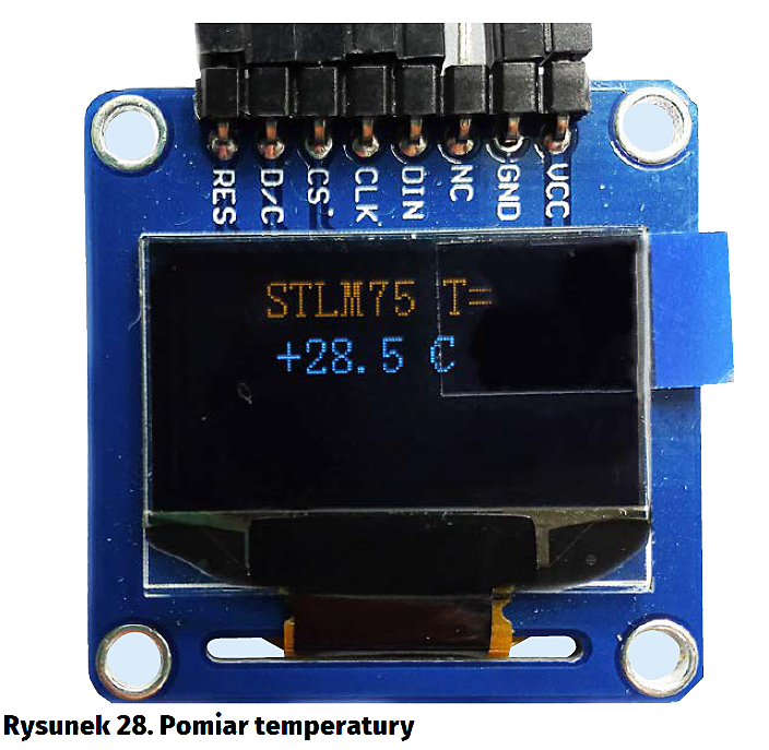 W czasie testu procedura STLMTempRead() była wywoływana w niekończonej pętli. Dotkniecie czujnika palcem powodowało zwiększanie odczytywanej temperatury. Wynik działania programu z listingu 18 pokazano na rysunku 28.